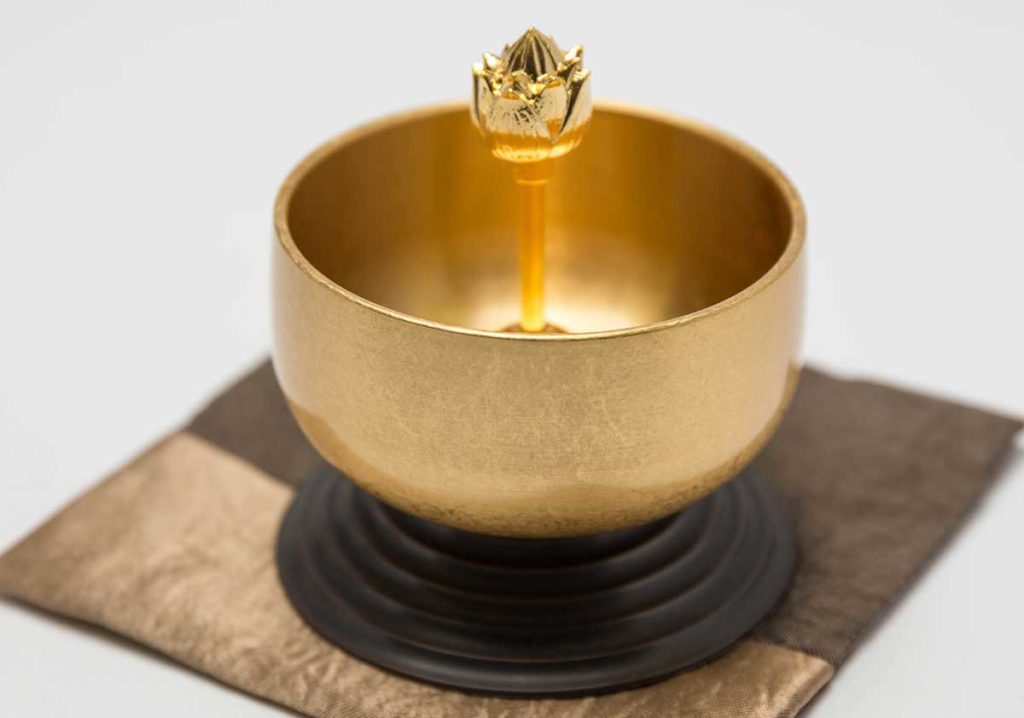 仏飯器(ぶっぱんき)は、仏壇にご飯をお供えする際に使用します。浄土真宗東本願寺派では金仏具を基本とし、鶴と亀がデザインされた仏具が使われます。また、ご飯は蓮の実をイメージした円筒形に盛り付けるため、盛糟(もっそう)という専用の仏具も必要です。