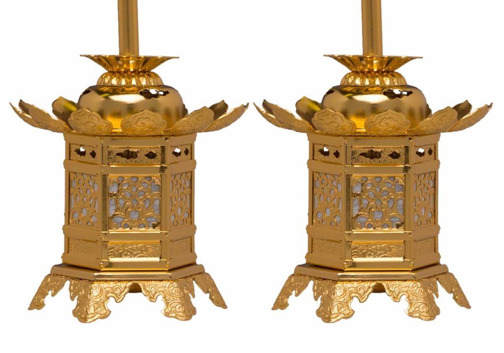 金灯籠(きんとうろう)は、ご本尊のお顔や姿を明るく照らす、燭台と同じ灯供養具(とうくようぐ)のひとつです。浄土真宗東本願寺派では、真っ直ぐにのびる蝶足をした金灯籠を使用します。