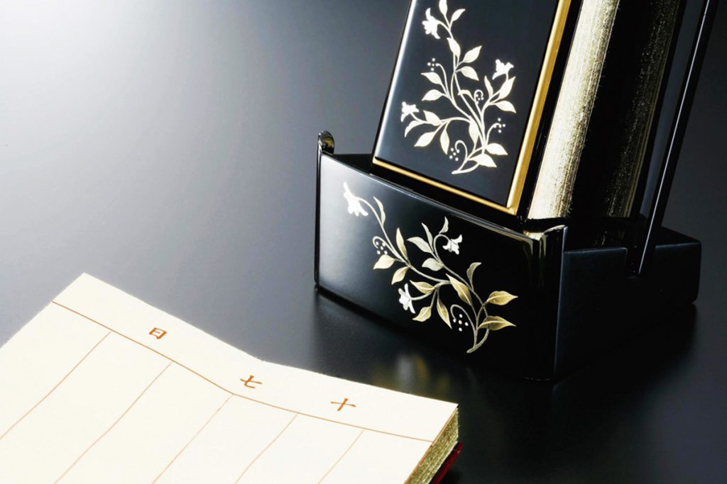 見台(けんだい)は、普段はしまってある過去帳を、仏壇に置く場合に乗せる台座です。