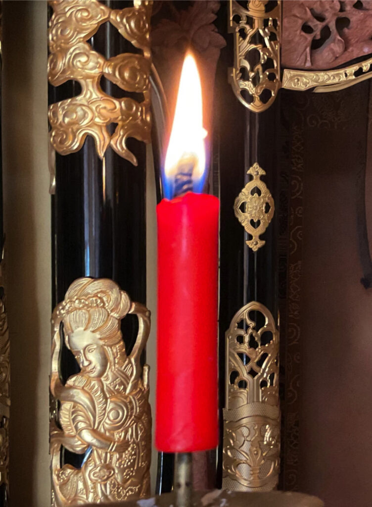 | ろうそく | 炎が心の闇や煩悩を照らし出し心を引き締める。 | ろうそく立てに合ったサイズを供える。 | おつとめが終わったらすぐに消す。線香同様息で吹き消さない。 |