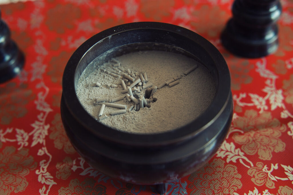 お線香に付いた火を息で吹き消すのはやめましょう。人の息には不浄とされているからです。消す際は手であおぐか、お線香を縦に持ったまま下に向かって軽く振ると簡単に消えます。