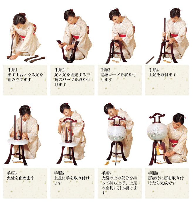 置型(行灯型)の盆提灯は分解しないと箱に入りません。各部品をゆっくりと外してばらばらにする必要があります。無理に力を加えると破損する場合もあるので丁寧に取り扱ってください。下記のような組立説明書がある場合は逆の手順で分解すれば確実です。