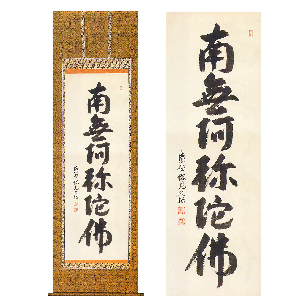 それらの言葉を紙や絹に書いて掛け軸としたものを名号本尊と呼び、木像・絵像と共にご本尊としています。