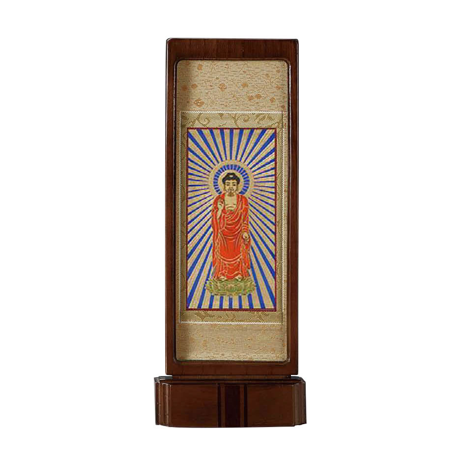 浄土真宗のご本尊としての阿弥陀如来は立像のみで、両手に来迎印(右手は親指と人差し指で丸を作り胸の前で外を向け、左手は薬指と親指の指先をあわせ下向きに下げている)を結んでいるのが特徴です。